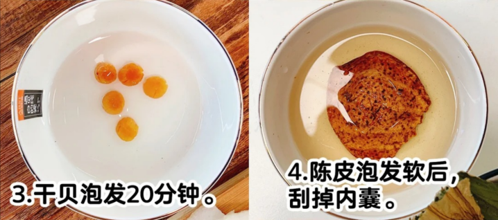 第三步:元贝温水洗净,干荷叶用温水泡软,剪成小块(别扔掉泡荷叶的水,后面有用!),陈皮温水泡发,剪成小块备用。