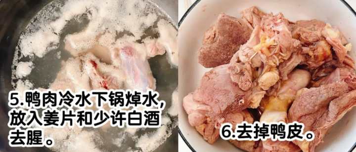 第二步:鸭肉要冷水下锅,放入生姜片和葱结,加上几勺料酒去腥,加上足量的清水,调到大火煮至沸腾,最后撇去浮沫(这一步去腥超关键!),捞出鸭块用温水冲洗干净(别用冷水,肉会变硬)。